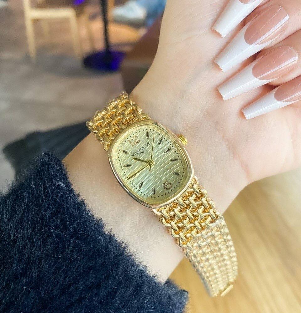 ساعة باتيك فيليب حريمي ذهبي بيضاوية سوار مجدول – Patek Philippe Women Golden Oval Woven Bracelet Watch