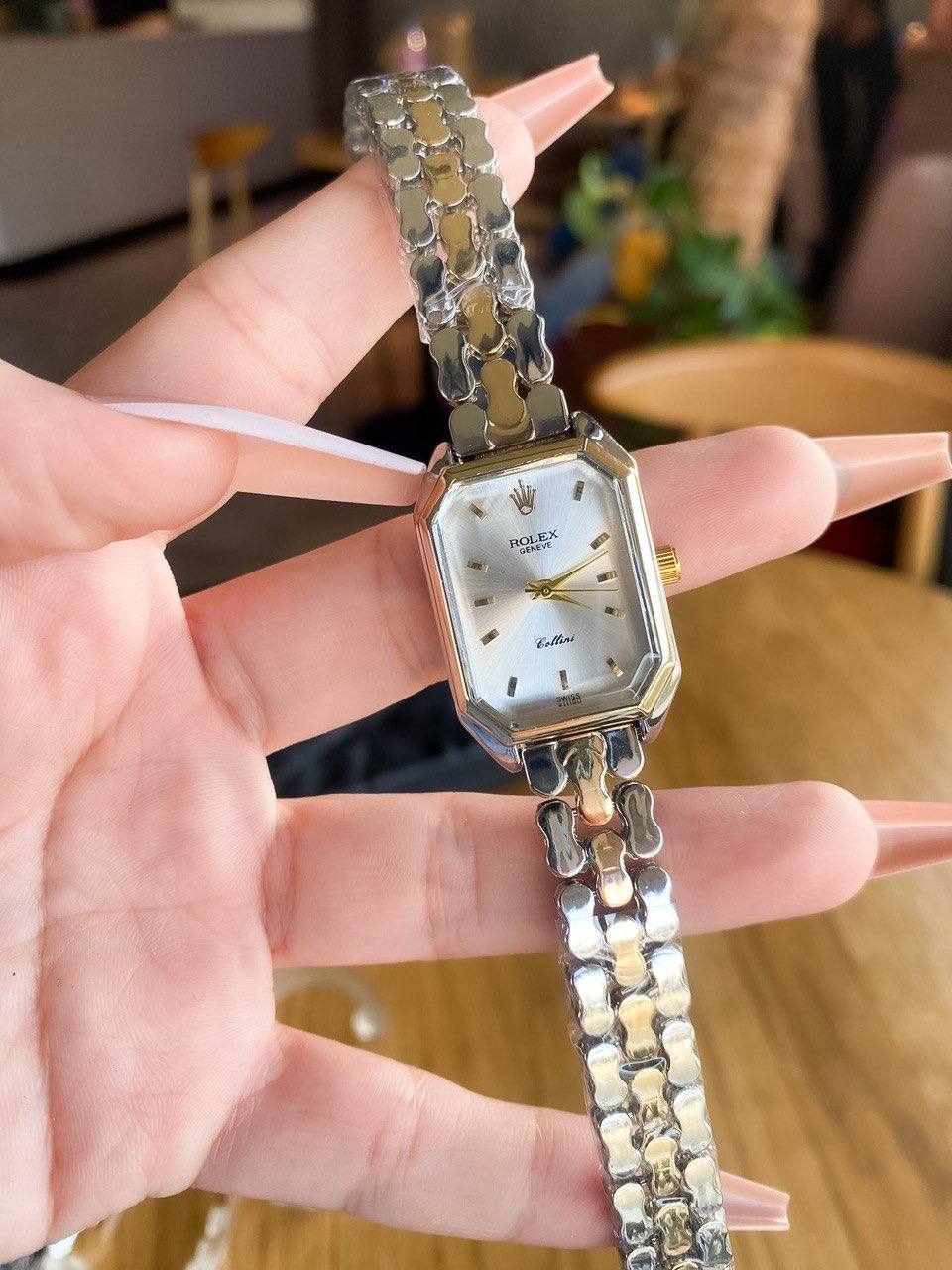 تعد هذه الساعة من رولكس قطعة استثنائية تمزج بين الفخامة الكلاسيكية واللمسة العصرية، حيث تأتي بهيكل مستطيل بلمسات هندسية مصقولة بدقة فائقة. يتميز الهيكل بلون الفضة الساطع مع تاج ذهبي جانبي يمنحها بريقاً دافئاً، مما يجعلها خياراً مثالياً للمرأة التي تبحث عن ساعة فريدة تكسر القواعد التقليدية بتصميم راقٍ وجذاب.