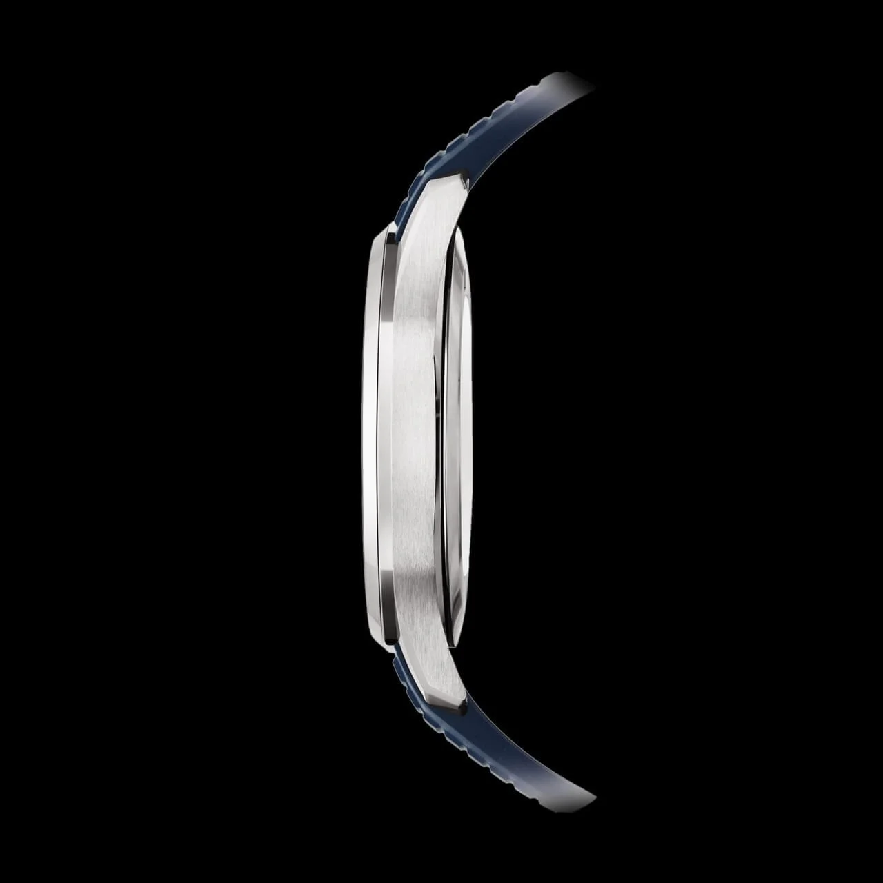 تأتي الساعة بهيكل متين من الإستانلس استيل الفضي بتصميمه الأيقوني الذي يجمع بين شكل الدائرة والمربع بانسجام تام. يكتمل هذا المظهر بسوار مطاطي (Composite) فائق الجودة باللون الكحلي، وهو مصمم ليتحمل الاستخدام اليومي المكثف مع توفير راحة استثنائية، بالإضافة إلى مشبك أمان محكم يضمن ثبات الساعة. كما تضم الساعة نافذة لعرض التاريخ عند الساعة الثالثة بتصميم عملي وأنيق.