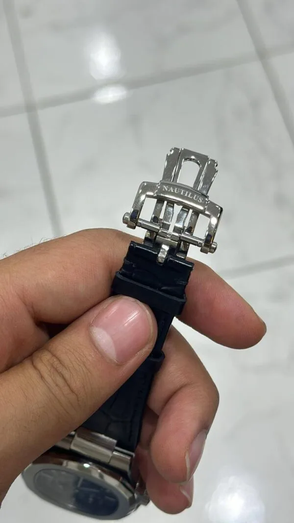 يأتي الهيكل مصنوعاً من الإستانلس استيل الفضي عالي الجودة والمقاوم للصدأ، محتفظاً بالإطار ثماني الأضلاع الأسطوري ذو الحواف المنحنية، وهو التصميم الذي جعل من عائلة نوتيلوس رمزاً للسيادة في عالم الساعات الفاخرة. يكتمل هذا المظهر الجذاب بسوار مصنوع من الجلد الطبيعي الفاخر باللون الأسود الملكي، والذي يمنح الساعة طابعاً رسمياً كلاسيكياً ويوفر راحة فائقة للمعصم عند الارتداء اليومي، مع مشبك أمان فضي محكم يحمل شعار العلامة التجارية. إن التباين اللوني بين رمادية الميناء وسواد الجلد يمنح الساعة شخصية فريدة تجمع بين الحداثة والتراث، وهي مصممة بدقة لتلبي تطلعات الشخصيات التي لا تقبل بأقل من الكمال في تفاصيل إطلالتها.