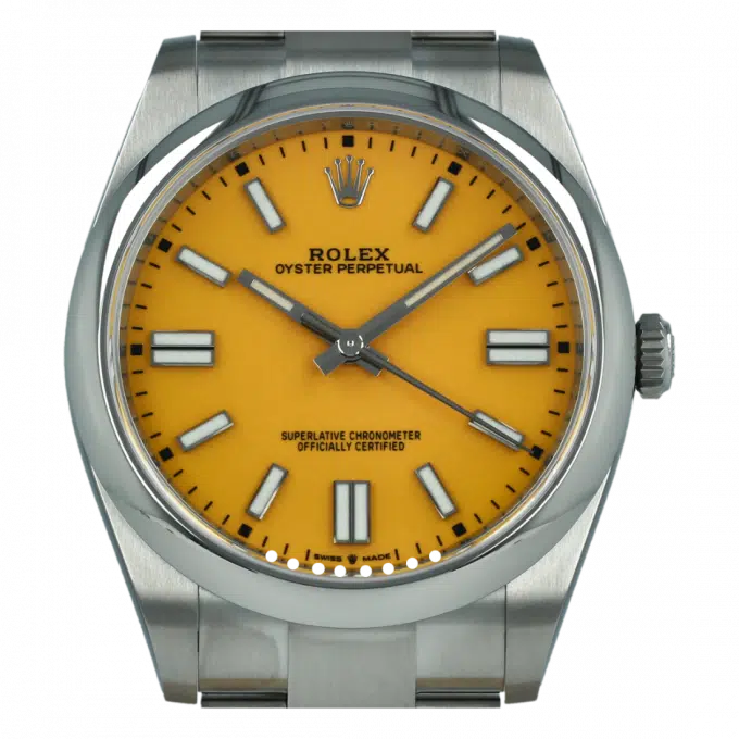 ساعة رولكس أويستر بيربتوال أصلية بمينا صفراء وسوار أويستر فولاذي.