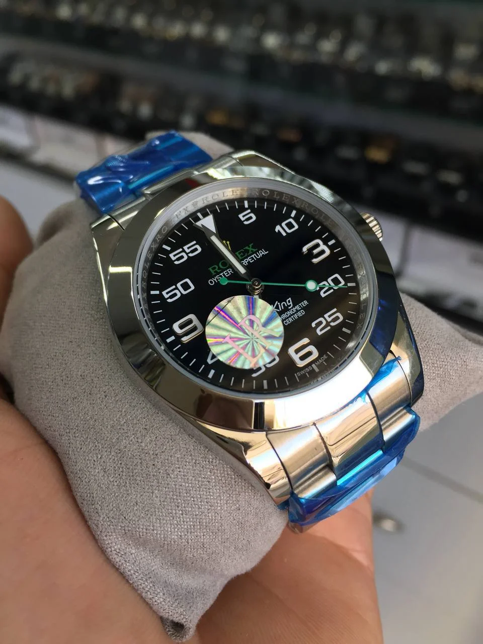 ساعة رولكس Air-King أصلية بمينا سوداء وسوار أويستر فولاذي.