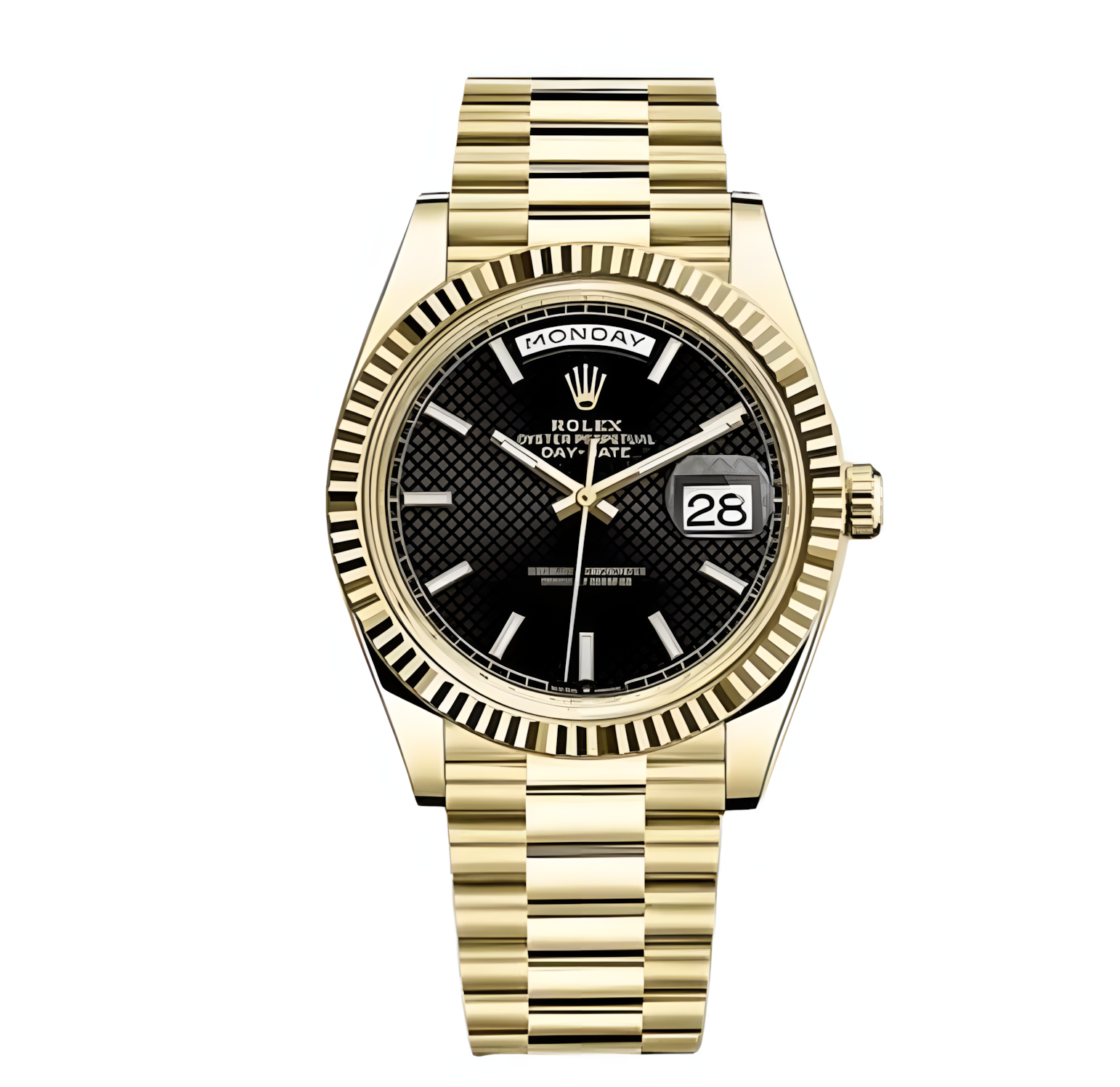 تتميز الساعة بهيكل بقطر 40 مم مع الإطار المخدد (Fluted Bezel) الأيقوني الذي يعكس الضوء ببراعة تامة، مما يضفي عليها لمسة من الفخامة التي لا يمكن تخطئها. المينا السوداء العميقة تبرز بوضوح المؤشرات والعقارب الذهبية، وتوفر خلفية مثالية لعرض يوم الأسبوع بالكامل عند الساعة 12 والتاريخ عند الساعة 3. يكتمل هذا المظهر الملكي بسوار “بريزيدنت” (President bracelet) الأسطوري، المكون من حلقات ثلاثية دائرية مصمتة، والذي يوفر راحة استثنائية وهيبة لا تضاهى على المعصم.