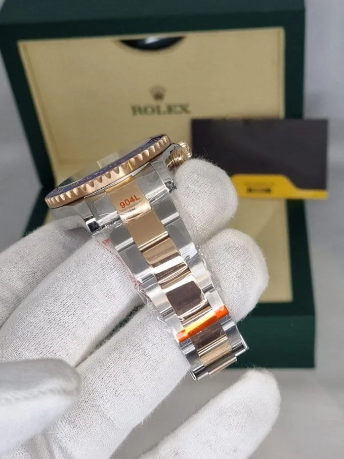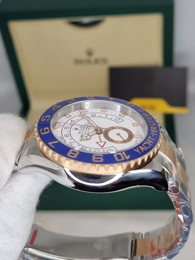 تأتي الساعة بهيكل “أويستر” متين يدمج بين الذهب الوردي والفولاذ، مع إطار (Bezel) دوار من السيراميك الأزرق (Cerachrom) المزين بأرقام وتدرجات مطلية بالذهب الوردي، مما يخلق تبايناً لونياً ساحراً يخطف الأنفاس. المينا الأبيض الناصع يتميز بوضوح تام، وتزينه عقارب ومؤشرات محددة بالذهب الوردي، مع قرص العد التنازلي الخاص بسباقات اليخوت الذي يضفي طابعاً تقنياً معقداً وجذاباً. يكتمل هذا التصميم الراقي بسوار “أويستر” (Oyster) الثلاثي الحلقات الذي يمزج بين الذهب والصلب، ليمنحك توازناً مثالياً بين القوة والهيبة الملكية على معصمك.