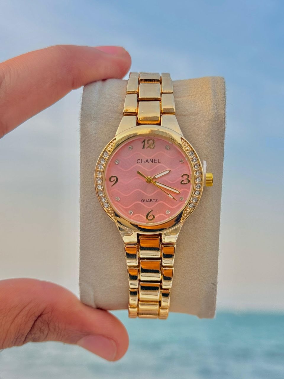 ساعة شانيل حريمي ذهبي ميناء وردي متموج مرصعة كريستال – Chanel Gold Pink Wave Dial Women’s Watch