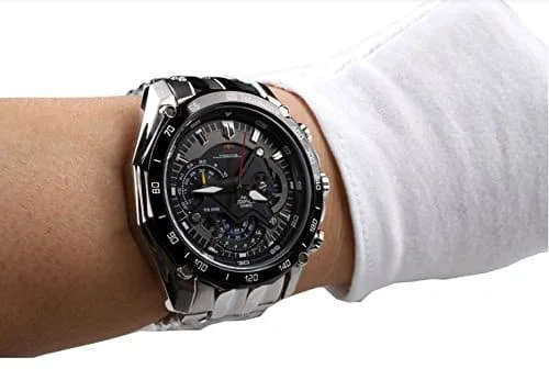 تعتبر ساعة Casio Edifice EF-550RBSP-1AV تجسيداً حقيقياً للشراكة التاريخية بين كاسيو وفريق “Red Bull Racing”، وهي مصممة خصيصاً للرجل الذي يعشق عالم السباقات والسيارات السوبر رياضية. ما يميز هذا الإصدار هو المينا السوداء العميقة التي تحتوي على قرص دوار عند موضع الساعة 6 مستوحى من مراوح التبريد في محركات السباق، مما يعطي الساعة طابعاً ميكانيكياً مذهلاً وحركة بصرية تخطف الأنظار مع كل ثانية تمر.