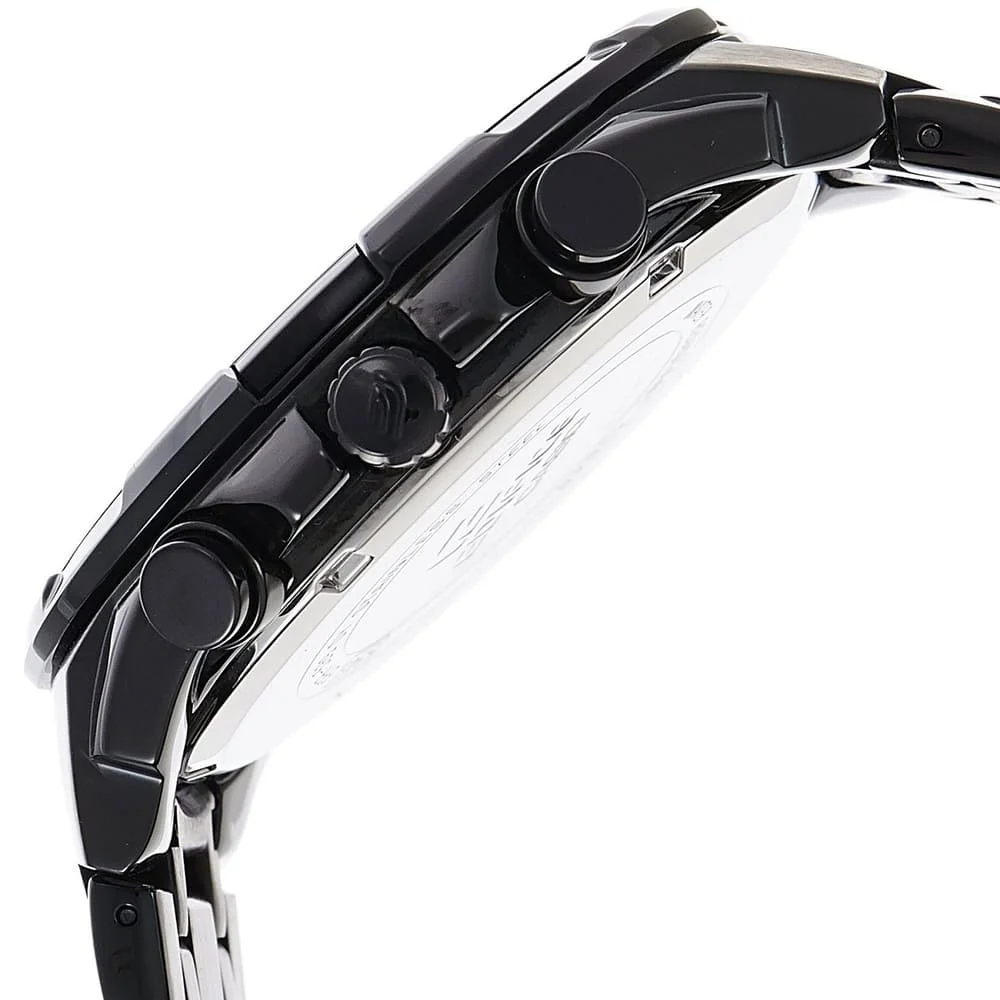 تُعد ساعة Casio Edifice EFR-539BK-1AV الخيار الأمثل للرجل الذي يبحث عن الفخامة الغامضة والقوة في قطعة واحدة. ينفرد هذا الموديل بتصميمه “الأسود الكامل” (Full Black) الذي يمنحك مظهراً يوحي بالثقة والتميز، حيث تم طلاء الهيكل والسوار بطبقة “Ion Plating” السوداء المقاومة للخدش وتغير الألوان، مما يحافظ على بريق الساعة الأسود لسنوات طويلة ويجعلها قطعة أساسية في مجموعة أي رجل يقدّر الأناقة العصرية.