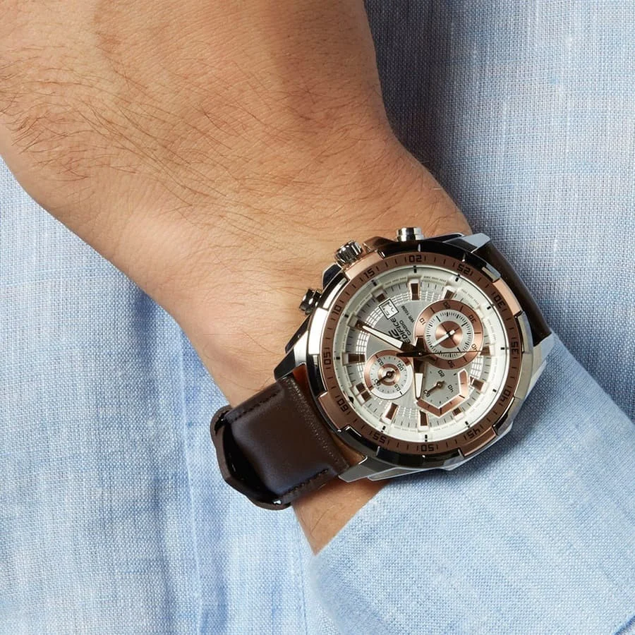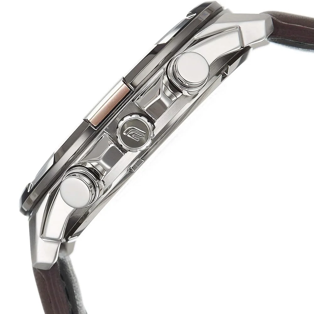ساعة كاسيو إيديفيس EFR-539L-7AV: أناقة النقاء الفضي بلمسة الجلد البني الكلاسيكي