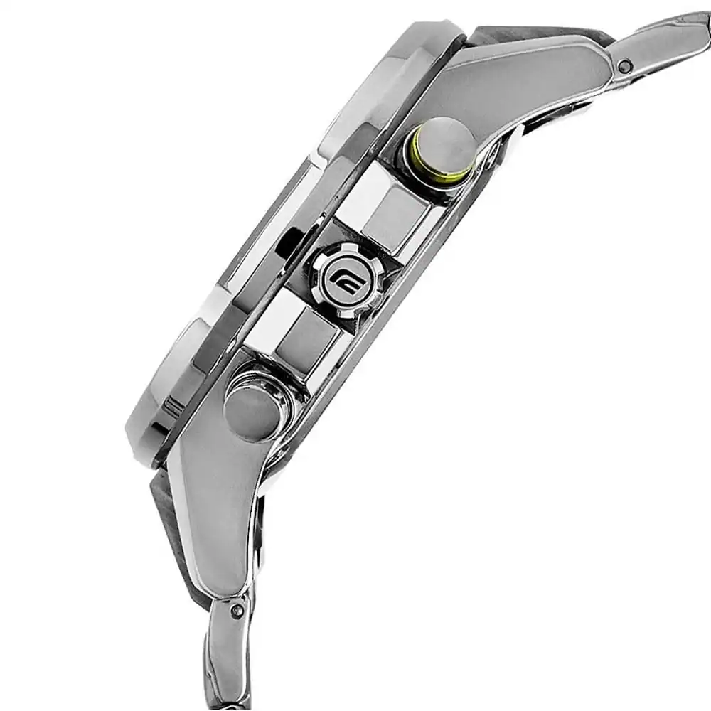 تأتي الساعة بقطر رائع يبلغ 54 مم، مما يمنحها حضوراً “تكنولوجياً” طاغياً على المعصم. المينا السوداء العميقة تتميز بتصميم هندسي معقد متعدد الطبقات، يتداخل فيه اللون الفضي والمعدني ليخلق مظهراً ميكانيكياً فريداً. الهيكل والسوار مصنوعان من الستانلس ستيل (الفولاذ المقاوم للصدأ) عالي الجودة، مع سوار مصقول بعناية يجمع بين المتانة واللمعان الجذاب، ويضمن ثباتاً فائقاً على اليد بفضل قفل الأمان المزدوج.