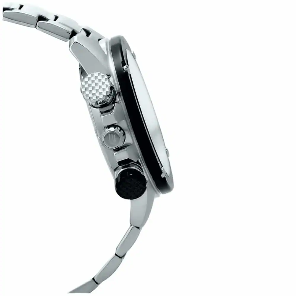 تأتي الساعة بقطر ضخم يبلغ 52 مم، مما يمنحها حضوراً مهيباً وملفتاً للأنظار على المعصم، مع هيكل صلب مصنوع من الستانلس ستيل (الفولاذ المقاوم للصدأ) عالي الجودة. المينا السوداء العميقة تحتضن ثلاث عدادات كرونوغراف (ساعة إيقاف) دقيقة جداً، بتوزيع هندسي متطور يسهل قراءة البيانات بلمحة واحدة. بوزن 175 جرام، ستشعر بمدى فخامة وخامة المعدن الياباني الأصلي المستخدم في تصنيع هذه القطعة، خاصة مع السوار المعدني الفضي المصقول والمزود بقفل أمان مزدوج لضمان الثبات التام والراحة طوال اليوم.