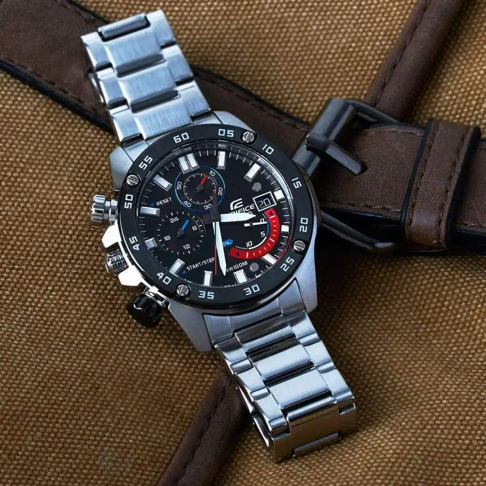 تعتبر ساعة Casio Edifice EFR-558DB-1AVUEF واحدة من أكثر الساعات هيبة في مجموعة إيديفيس الكلاسيكية المتطورة، حيث صُممت للرجل الذي يبحث عن “القوة الهادئة” والجمال الرياضي الصرف. ما يميز هذا الموديل هو التباين البصري المذهل بين الهيكل الفضي اللامع والإطار العلوي (Bezel) المصبوغ باللون الأسود المطفأ بتقنية “Ion Plating” المقاومة للخدش، مما يمنح الساعة طابعاً ميكانيكياً يشبه لوحات قيادة السيارات الرياضية الخارقة، ويجعلها القطعة المثالية لمن يريد ساعة تليق بجدية العمل وحماس المغامرة.