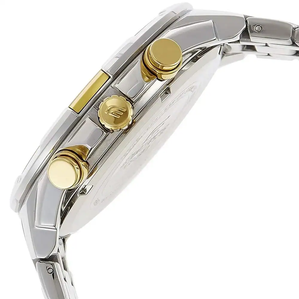 تُعد ساعة Casio Edifice EFR-539SG-1A الإصدار الأكثر هيبة وغموضاً في مجموعة الـ 539 ثنائية اللون (Two-Tone)، حيث تجمع ببراعة بين عمق المينا السوداء وبريق الذهب الأصفر المصقول. صُمم هذا الموديل للرجل الذي يبحث عن حضور “قيادي” لا يخطئه أحد؛ فهي ليست مجرد ساعة، بل هي بيان عن القوة والأناقة الأرستقراطية. تبرز اللمسات الذهبية على الإطار الخارجي الضخم، والتاج، والمؤشرات، لتصنع تبايناً مذهلاً مع خلفية المينا السوداء، مما يجعلها القطعة المثالية لتعزيز إطلالتك في المناسبات الرسمية والاجتماعات الهامة.