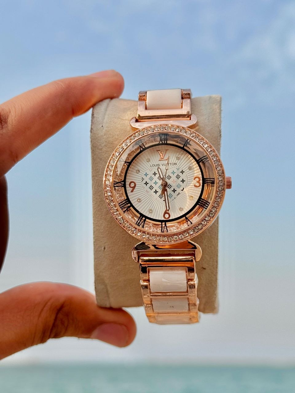تجسد ساعة لويس فوتون الموضحة في الصورة مزيجاً ساحراً بين الفخامة العصرية والتفاصيل الرقيقة. تأتي الساعة بهيكل دائري مطلي باللون الذهب الوردي (Rose Gold) المصقول، يحيط به إطار (Bezel) مرصع بصفوف دقيقة من الفصوص الكريستالية اللامعة التي تمنح المعصم بريقاً لافتاً في كل حركة.