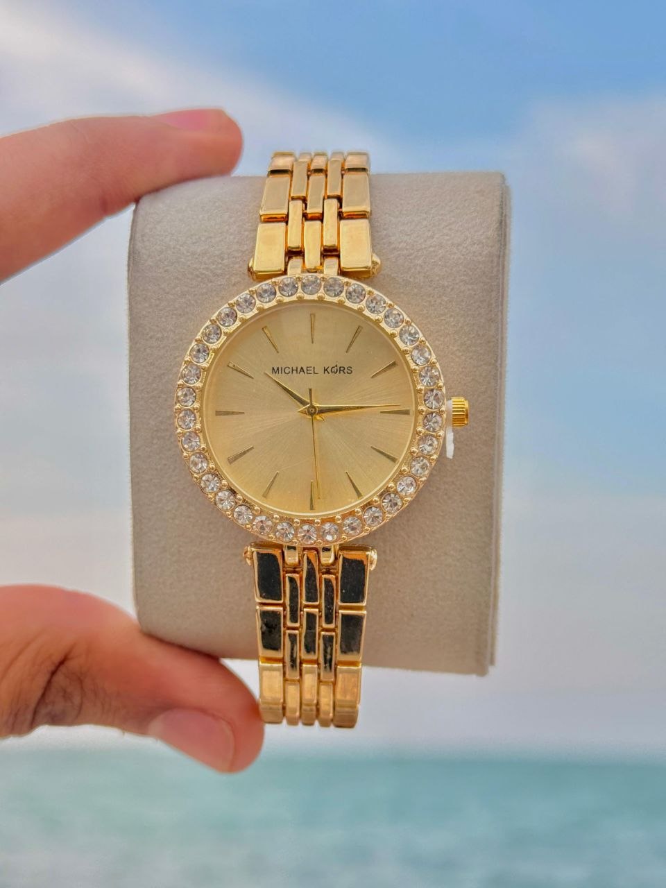 تجسد ساعة مايكل كورس النسائية الموضحة في الصورة ذروة الأناقة المضيئة والرقي العصري، حيث تأتي بتصميم ذهبي كامل (Full Gold) يفيض بالفخامة والجاذبية. تنفرد هذه الساعة بهيكل دائري مصقول بعناية، يزدان بإطار (Bezel) مرصع بصفوف كاملة من الفصوص الكريستالية الكبيرة التي تلتقط الضوء ببراعة لتمنح معصمك وهجاً ساحراً يخطف الأنظار في كل حركة، مما يجعلها قطعة الإكسسوار المثالية للمرأة التي تبحث عن الفخامة التي تجمع بين روح “المودرن” وكلاسيكية المجوهرات.
