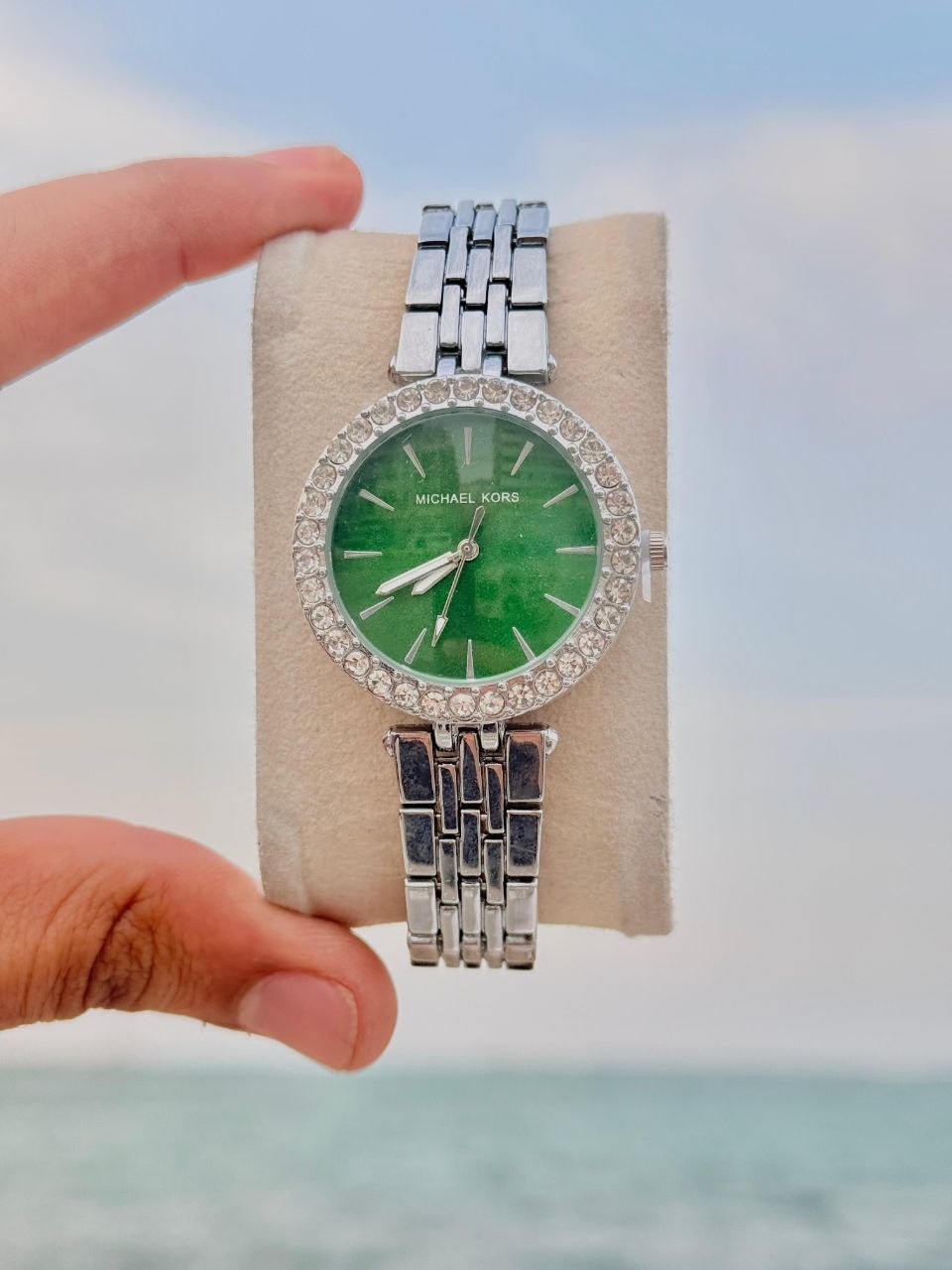 ساعة مايكل كورس حريمي فضي ميناء أخضر مرصعة كريستال – Michael Kors Women Silver Emerald Green Dial Watch